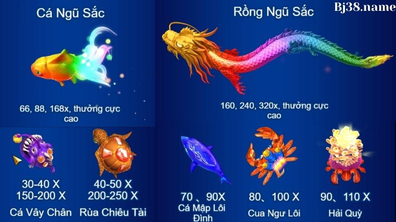 - Rồng ngũ sắc: Xuất hiện nếu bắn trúng có thể nhận ưu đãi tăng thưởng từ 160x đến 320x.