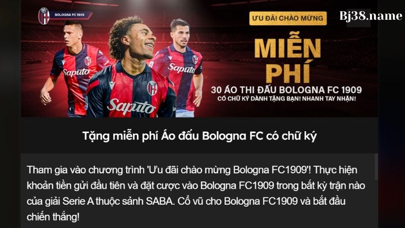 Cổ vũ cho đội bóng Bologna FC 1909 và nhận ngay chiếc áo đấu có chữ ký độc quyền từ đội bóng. Để tham gia, bạn cần thực hiện nạp tiền và đặt cược vào các trận đấu có đội Bologna FC trong giải Serie A thuộc sảnh SABA.
