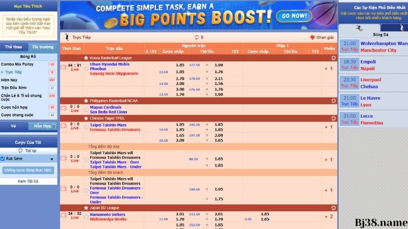 Tại thể thao Bj38, bạn không chỉ được trải nghiệm sự kịch tính của những trận cầu hấp dẫn mà còn có cơ hội thắng phần thưởng lớn với các tỷ lệ cược cạnh tranh. Bạn có thể đặt cược theo nhiều hình thức như cược chấp, cược tài/xỉu, cược tỷ số chính xác và nhiều loại cược khác.